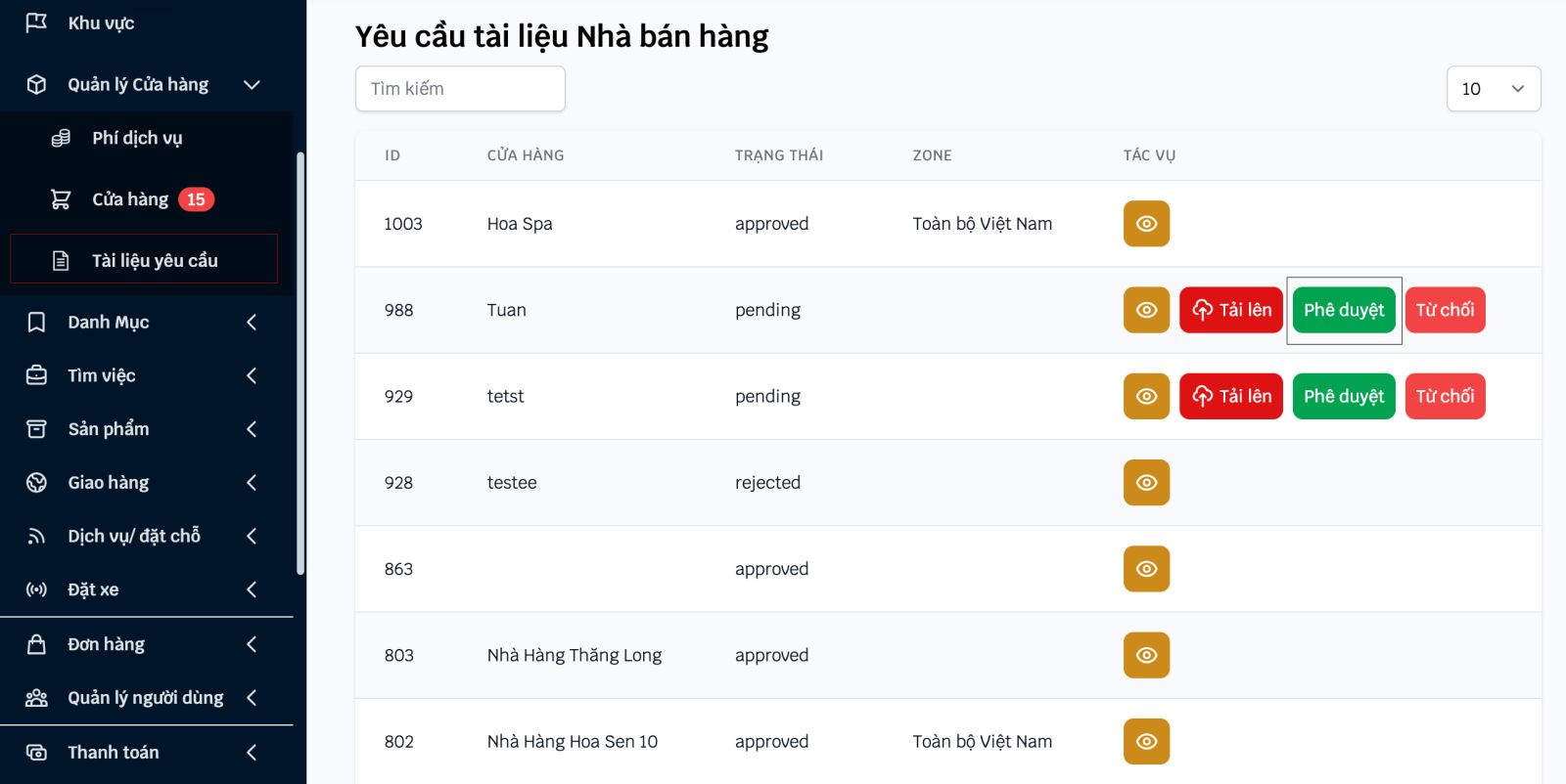 Vào Admin chọn Quản lý cửa hàng -> Tài liệu yêu cầu -> chọn Cửa hàng và nhấn vào nút "Phê duyệt".