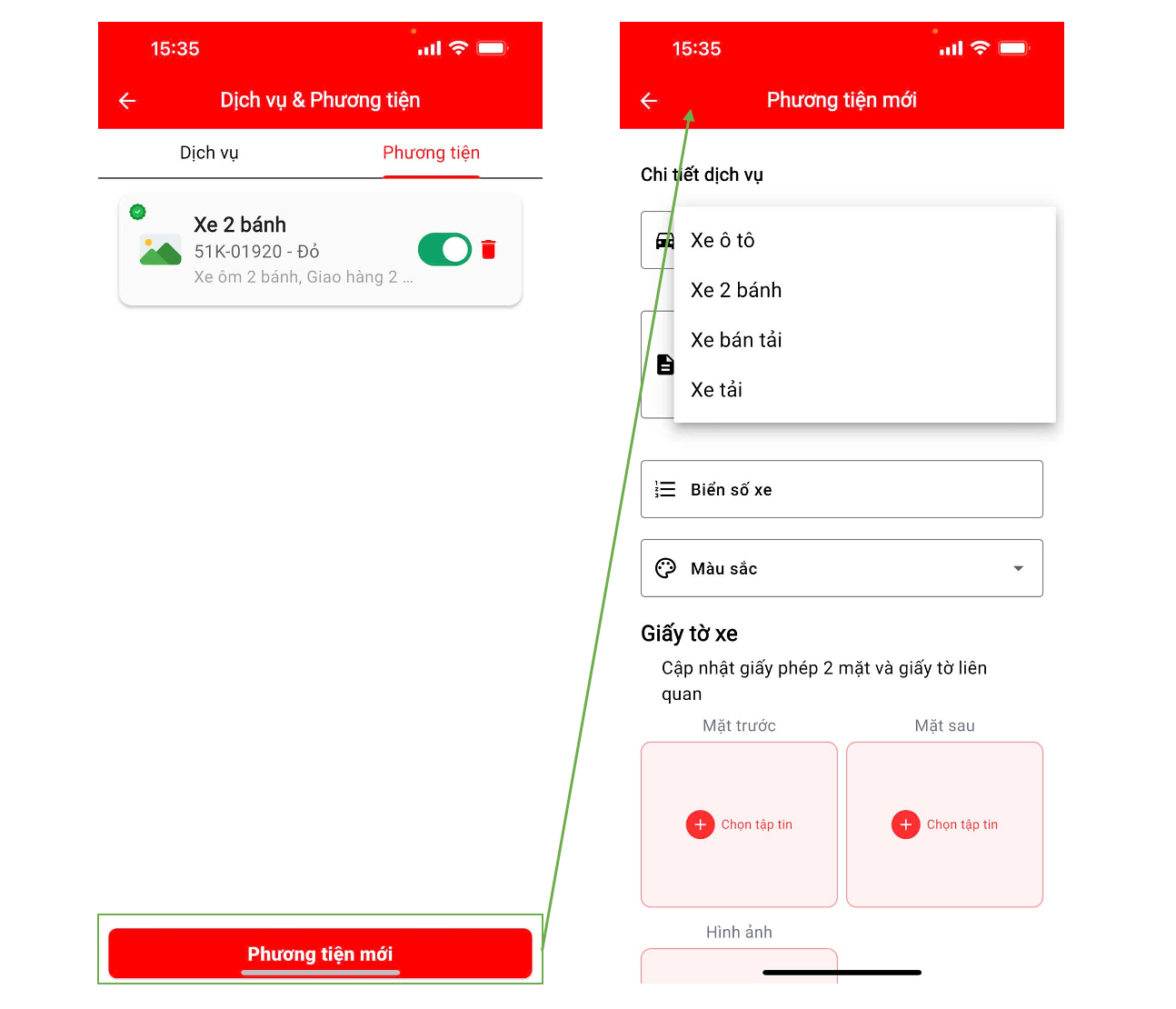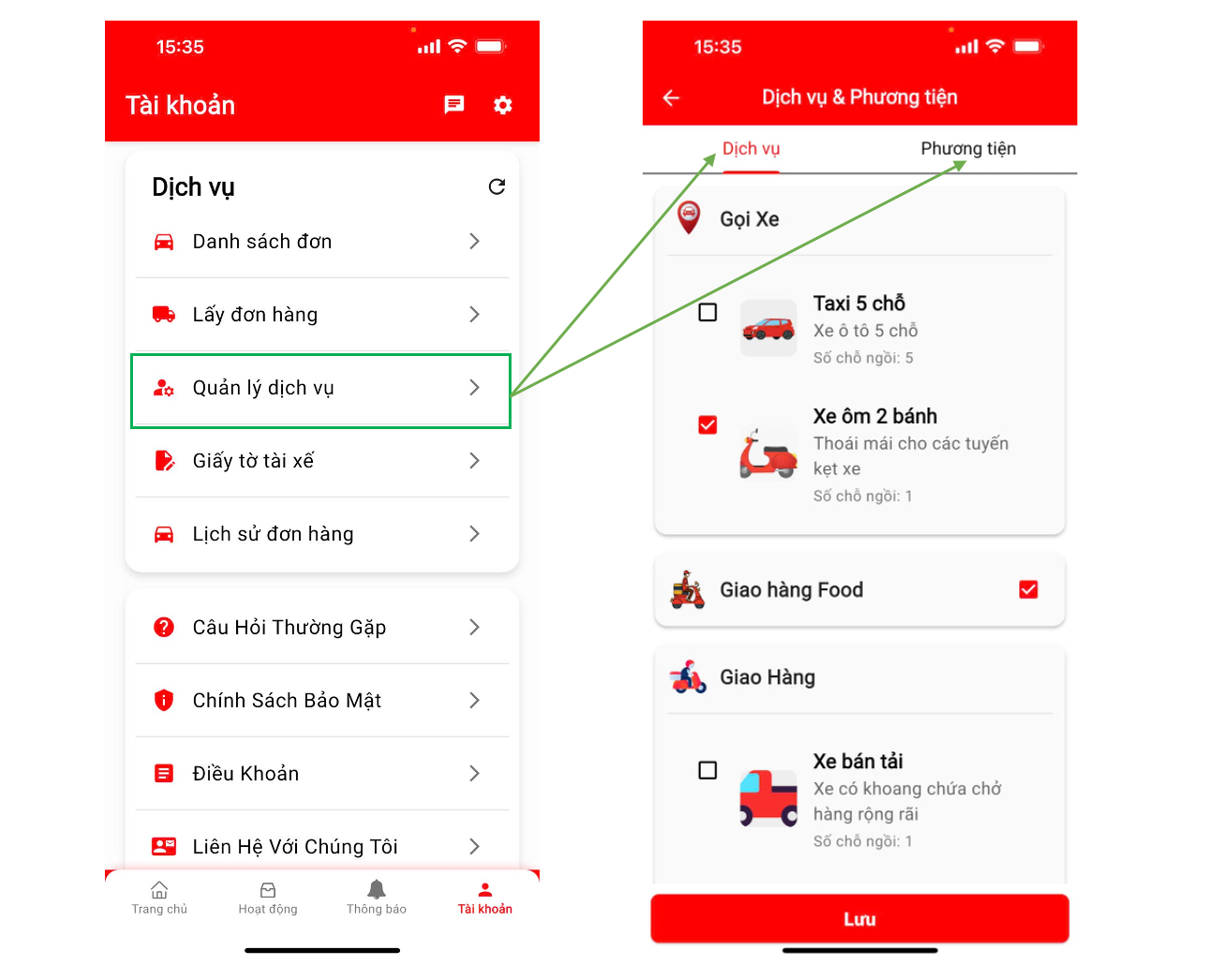 Phương tiện hiện có là: “Xe máy” thì dịch vụ có thể bật : Gọi xe – xe ôm 2 bánh, Giao hàng Food (loại xe 2 bánh), Dịch vụ gọi lại, Lái xe hộ - Lái hộ xe máy.